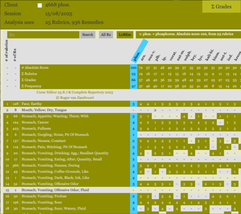 Case CCX. Dr. Bolle, a German Allopath, had a bad case of cancer of the stomach, which progressed rapidly during nine months of treatment. The patient was reduced to a skeleton; he could hardly drag himself about; his complexion was earthy, while vomiting ensued after taking food, or even a swallow of water; almost every time, a sourish, offensive fluid was ejected in significant quantities. Bearing the most remarkable resemblance to a mixture of water, ink and coffee grounds; the tongue was coated with a yellowish fur, and was dry; there was thirst: no appetite: constant nausea; fullness, painfulness of the stomach; sometimes a fine stitching and gurgling in the pit of the stomach; the abdomen was fallen in; the constipation could hardly be overcome; the feces were hard, crumbly, blackish-brown. Dr. Nichol, a Homeopath, gave Phos. 200, which cured him. Dr. Bolle then became a Homeopath. Eighteen months after the old symptoms returned, and were speedily dissipated by Phos. 3. given by Dr. Bolle. Dr. G. E. Shipman.