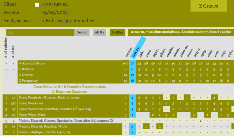 Bookkeeper, at. 28. Overstrained eyes. "Feel like chilblains," must wipe them often and pull at the lashes. Is emmetropic, though can read No. 15 at fifteen feet with difficulty from blurring of the letters, not improved by glasses. A candle held twelve inches seems double, and the left image is seen with the right eye, hence he has asthenopia from paresis of the internal recti muscles. Natrum mur. 300 cured. (T. F. Allen.)